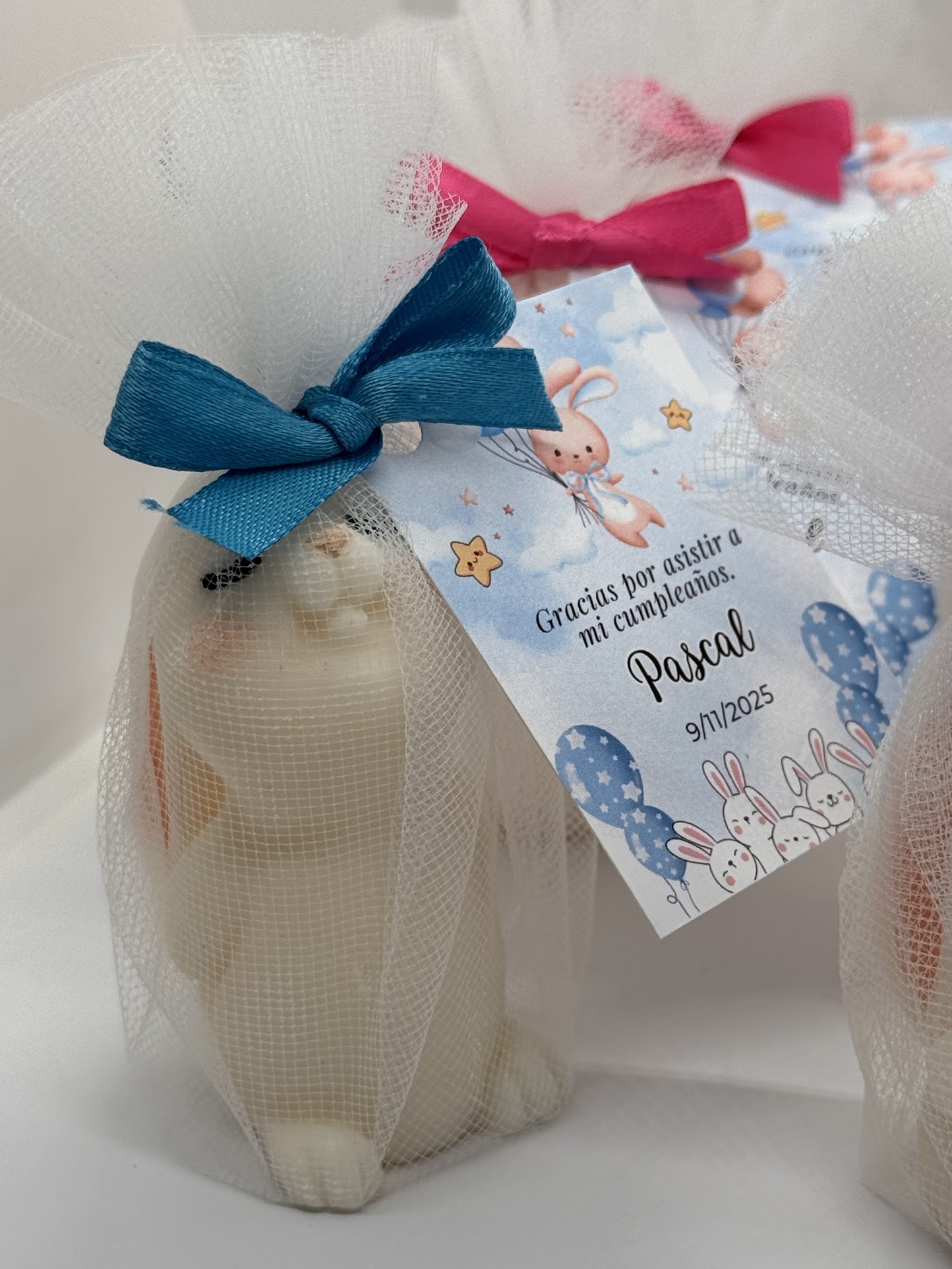 Su diseño encantador en forma de conejito capta la atención de niños y adultos por igual, mientras que la presentación premium en tul le da ese toque especial que hace la diferencia. La inclusión de una tarjeta personalizada te permite agregar tu mensaje único, diseño especial o detalle particular que hará de cada souvenir baby shower conejito un regalo verdaderamente memorable.