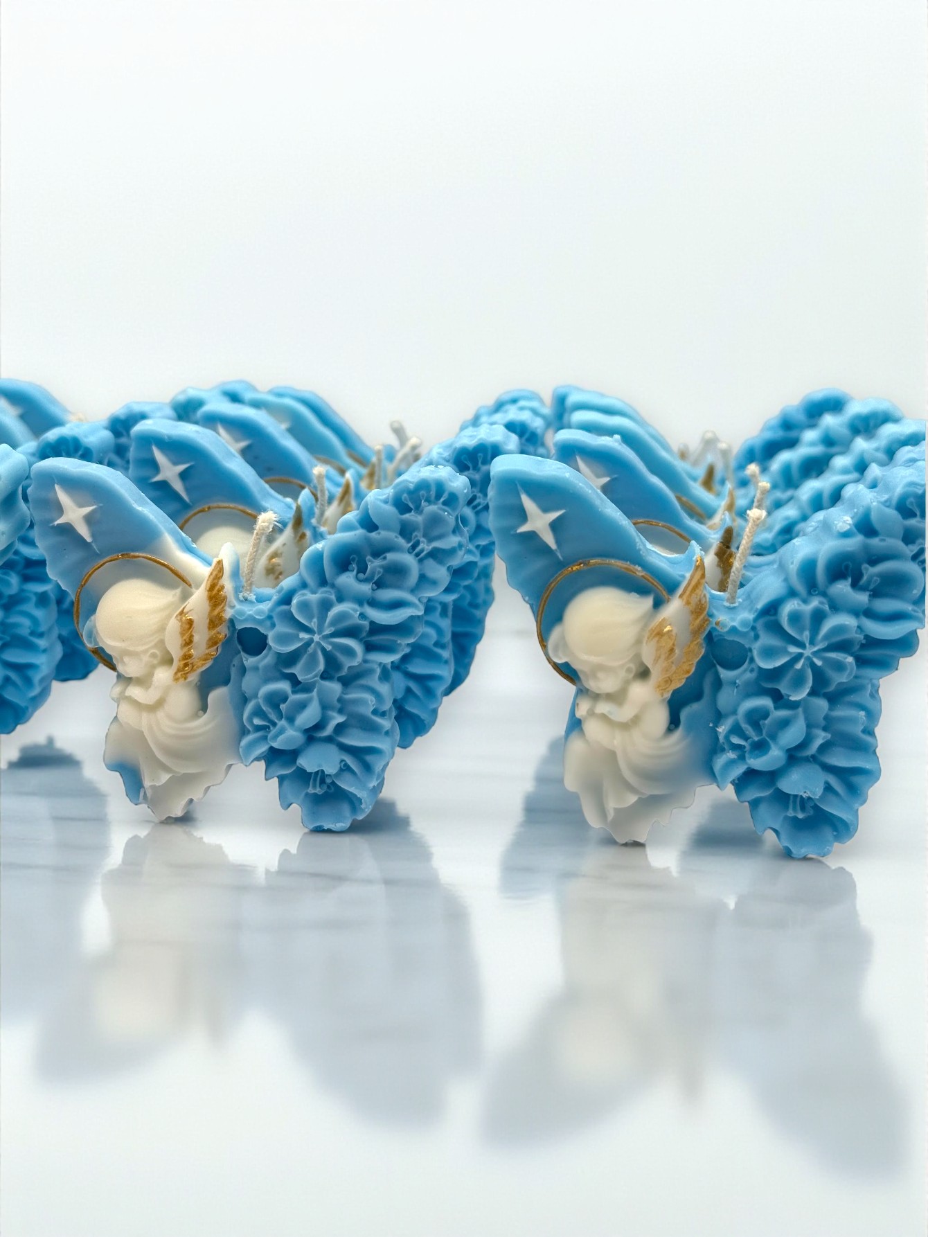 Cada vela está elaborada artesanalmente con cera de soja 100% natural, garantizando una combustión limpia y libre de toxinas. El diseño de ángel con alas de mariposa simboliza protección, transformación y espiritualidad, conviértiendo este souvenir en el detalle perfecto para ceremonias religiosas y celebraciones especiales.