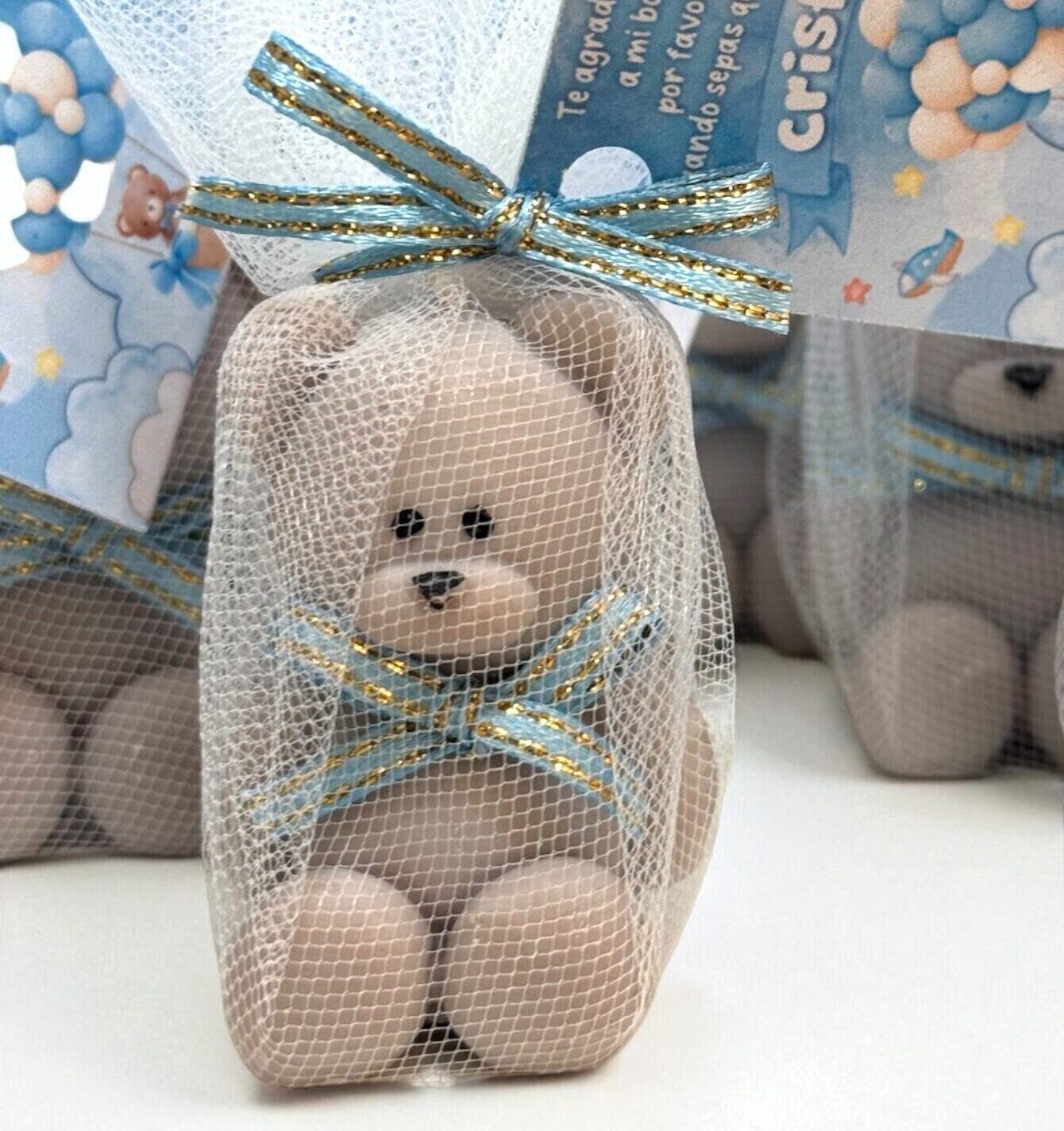 Cada vela está elaborada artesanalmente con cera de soja 100% natural, garantizando una combustión limpia y libre de toxinas. El adorable diseño de osito combinado con la elegante presentación en tul crea un souvenir que combina ternura, delicadeza y funcionalidad.