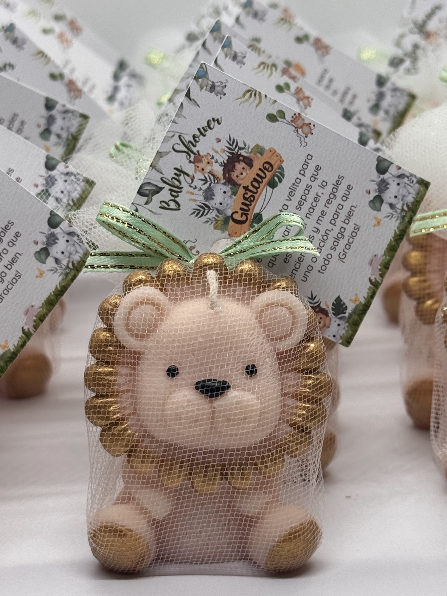 El diseño de león tierno envuelto en tul la convierte en un souvenir diferente que combina funcionalidad como vela decorativa con un hermoso detalle de presentación. Ideal para baby showers, bautizos, cumpleaños infantiles, revelaciones de género y eventos corporativos familiares.